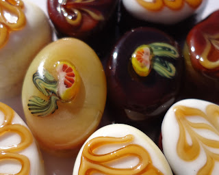 To the right is a collection of scrummy looking chocolate beads decorated with Lime, Grapefruit or Leaf murrini and texture stamps.