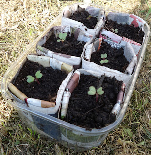 I'd already started to think about re-purposing deli and food trays with some holes punched in the bottom, this one contains cauliflower and cabbage seedlings which are ready for thinning out and potting on. One of the great thing about these paper pots is that you can plant the whole thing in the ground when your plants are big enough to go outside.