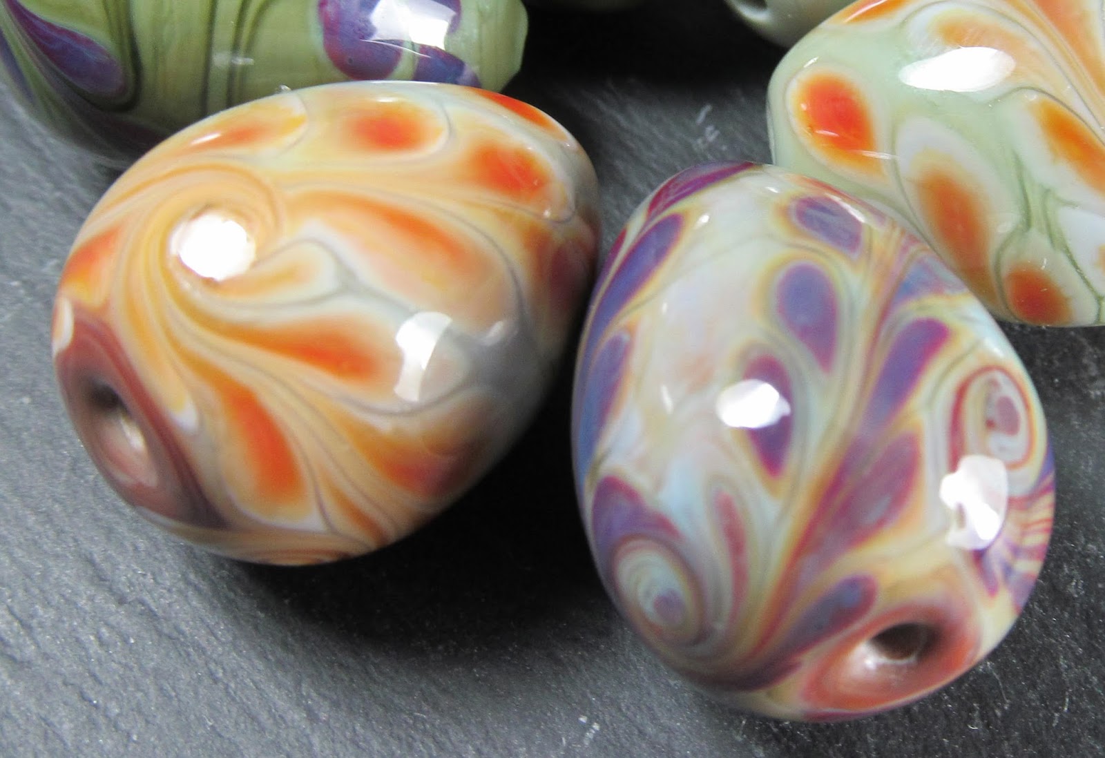 I have also been looking at two new shades of opaque red, Red Alert ltd run and Ladybug ltd run. Red alert is the darker of the two and has beautiful striations. I pulled a fine stringer of Red Alert and used it to create these poppy petals. The colours variation mades them look shaded and gives them a lot of depth and interest. The hearts below were also made with Red Alert, you can see the colour variation much more clearly here.