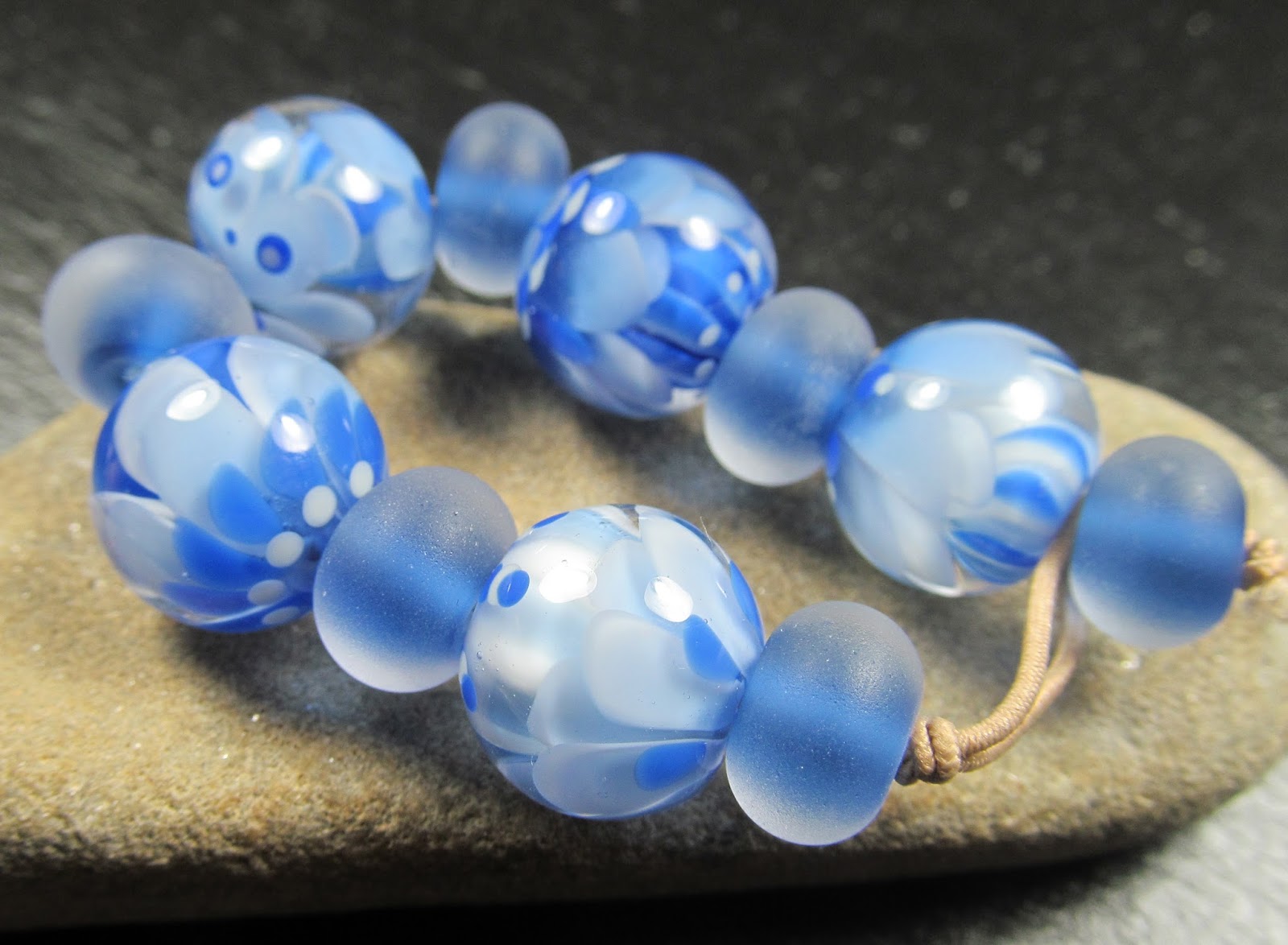 This last set are made with Slate ltd run, a pale and pretty transparent grey toned blue. Both the rounds and spacers are made with a core of Slate under Effetre Clear. The spacers have been tumble etched and the rounds decorated with large Effetre white dots under Aegean ltd run and my all time favourite green glass, Elphaba.