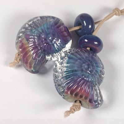 I have been working on a new to me bead style, baking collections of thin textured drop beads and beads with pairs of wings that stack up to form butterflies.